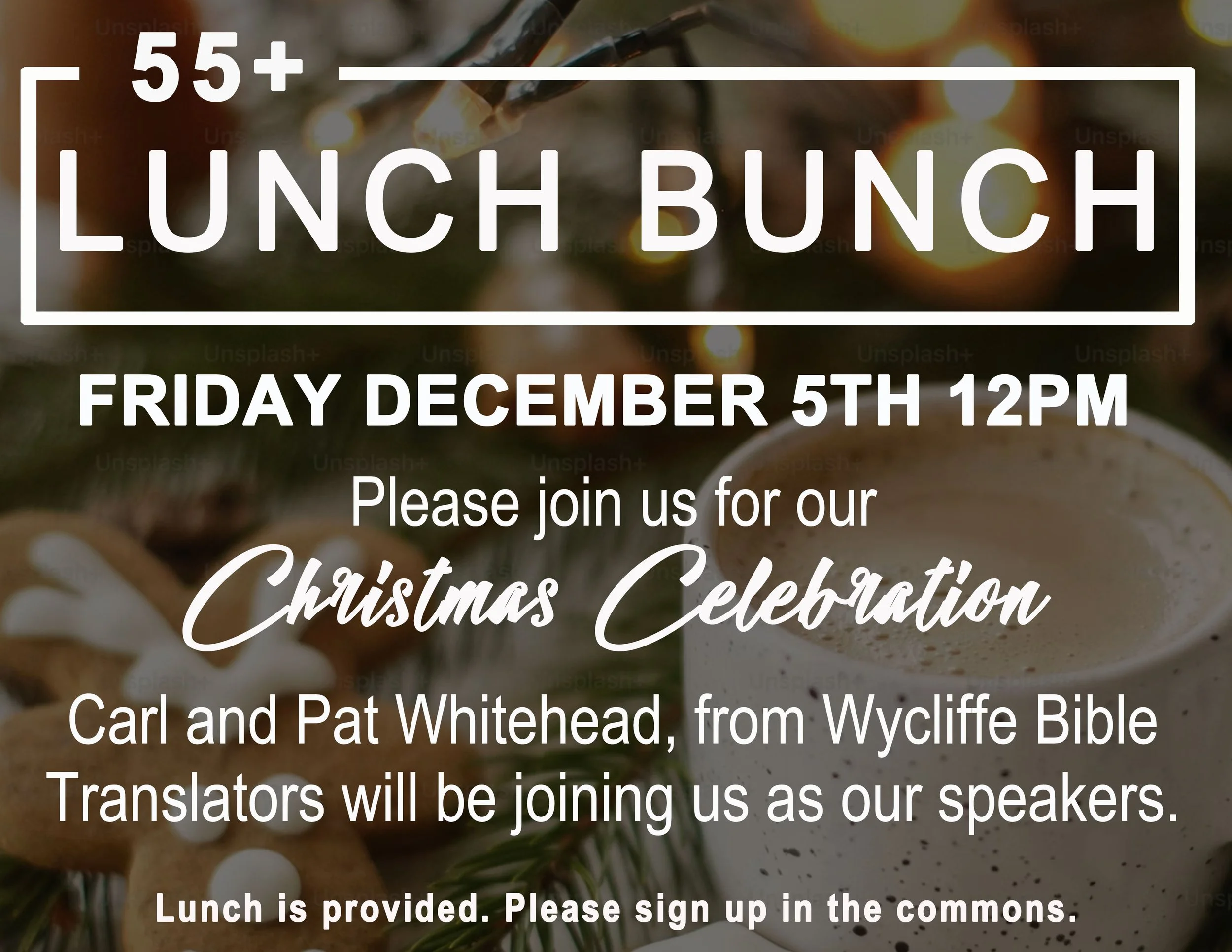 Everyone 55 and over is invited to join us for lunch. Following the lunch we will hear a presentation by Allan and Myrna Ronald about their recent trip to Beacon of Hope in Nairobi, Kenya. RSVP to the church office so we know how many to prepare for.